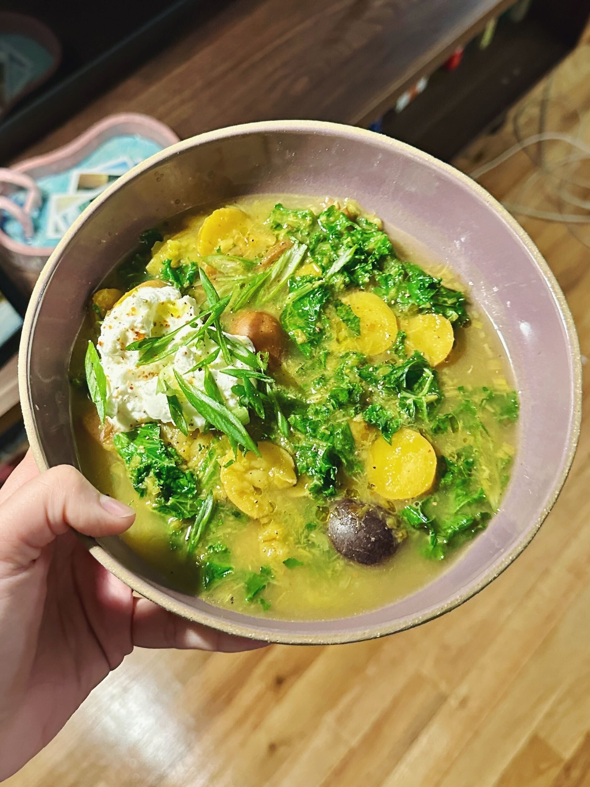 There’s something extra special and cozy about that first meal you cook in your home when you come back after a trip. The sounds and smells of sizzling alliums feel like the first step in shaking out the stillness and the coldness. Blasting the new Bad Bunny album and lighting a candle are the second and third steps. —Antara